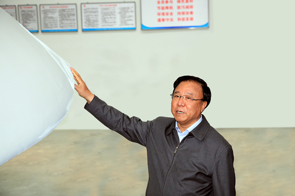 隨后,陸浩、徐守盛等各位領(lǐng)導和嘉賓相繼視察了包括中復、華銳、金風(fēng)科技的幾個(gè)酒泉產(chǎn)業(yè)化基地的風(fēng)電企業(yè)。在來(lái)到中國復材3兆瓦的葉片車(chē)間之后,陸浩認真聽(tīng)取了張定金的介紹匯報,當看到中復生產(chǎn)的3兆瓦葉片時(shí)非常高興,并與其他領(lǐng)導和嘉賓一起出席中復3.0MW風(fēng)力機葉片的投產(chǎn)儀式,中國復材副總經(jīng)理、中復連眾集團董事長(cháng)任桂芳、總經(jīng)理喬光輝陪同參觀(guān)。